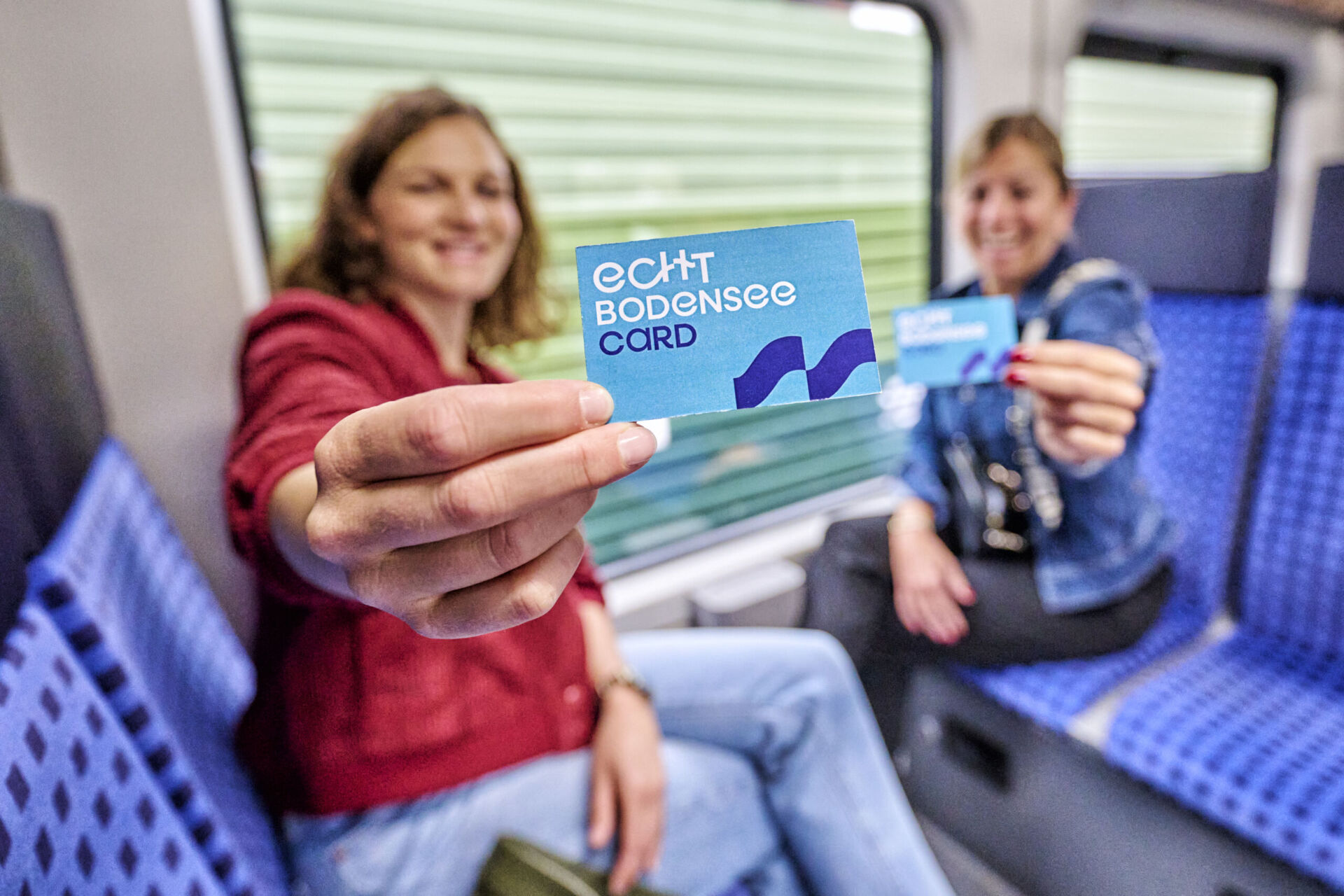 Zwei Frauen zeigen im Zug die Echt Bodensee Card vor.